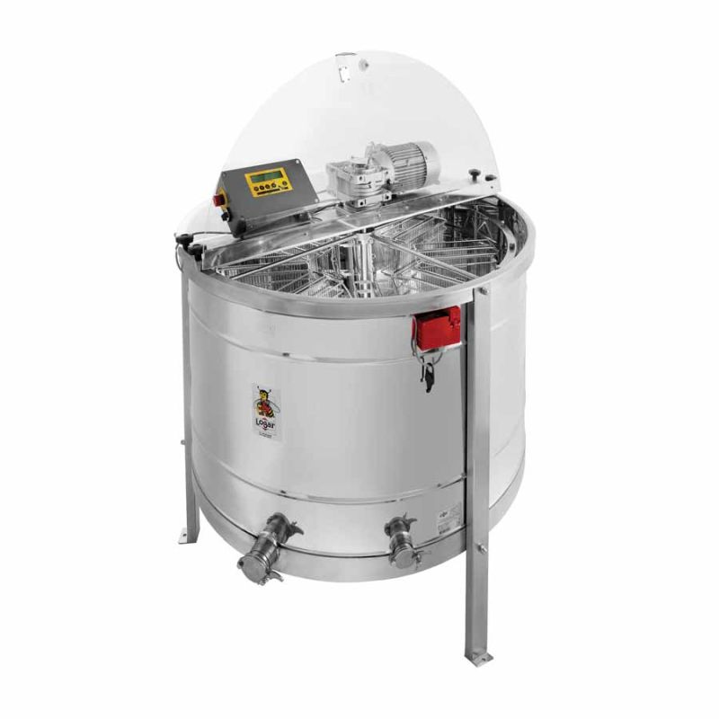 Extracteur auto‑retournant 16 cadres, avec moteur 750 W / 230 V, commande entièrement automatique et verrouillage de sécurité intégré empêchant l'ouverture du couvercle pendant le fonctionnement. Les poches à cadres de l'extracteur sont double-face, séparées par une plaque sur laquelle le miel s'écoule. L'extracteur est équipé de deux robinets-pince inox 2''. Le robinet-pince est installé au point le plus bas afin de permettre l'écoulement complet de tout le miel. Toutes les pièces en contact avec le miel sont réalisées en matériaux compatibles contact alimentaire. Le couvercle est en acrylique transparent.