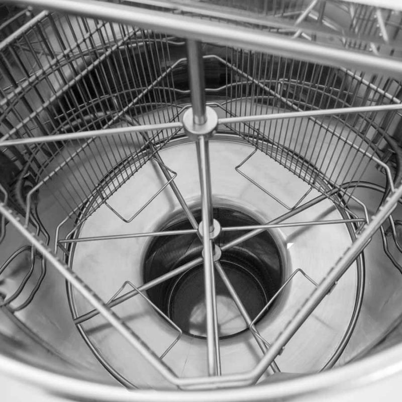 Le nettoyage de l'extracteur est simple. Toutes les pièces en contact avec le miel sont en matériaux conformes aux normes alimentaires. Le couvercle est monté sur charnières et en plexiglas transparent, permettant d'observer l'opération d'extraction.