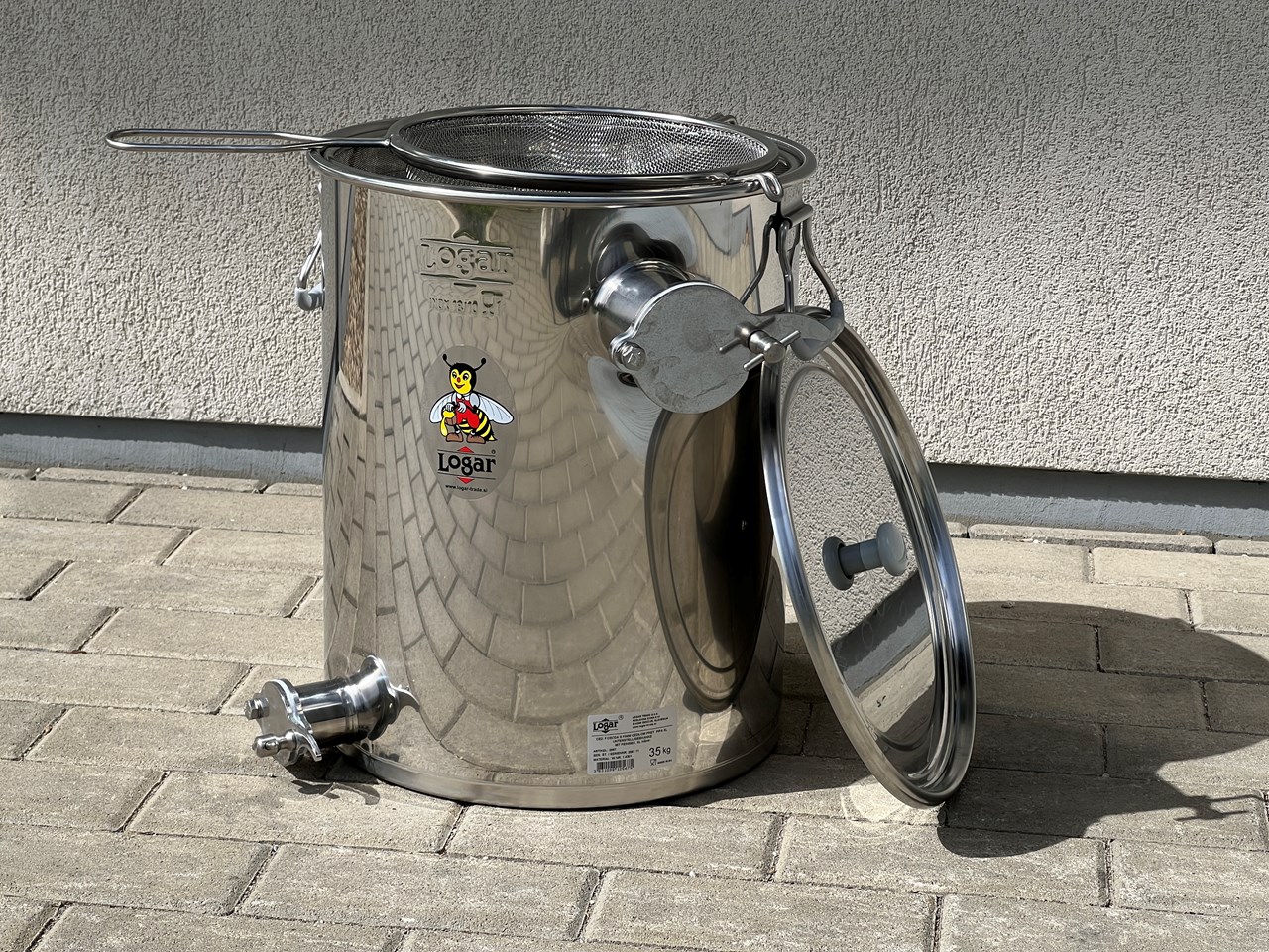 - Équipement : 2 robinets-pince soudés (robinet-pince supérieur XL pour débit de miel augmenté), tamis intérieur fin en tissu grillagé inox